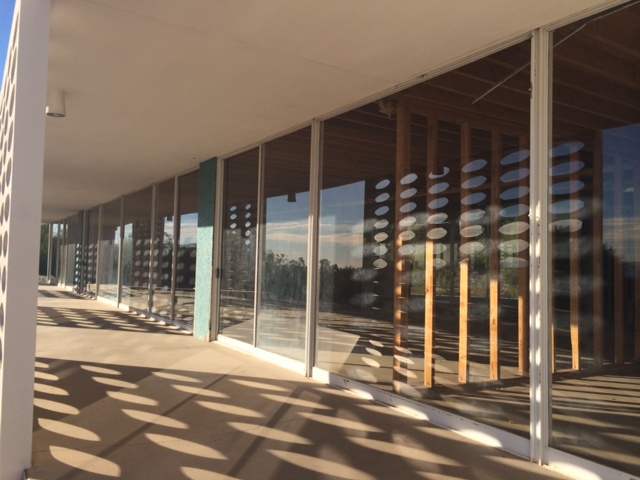 When looking in from the street, the home has a warm and inviting feel. ModernPhoenix.Net poetically stated the home "stands strong against it's surroundings, presenting a bold rectangular block of vivid color and brilliant white. The symmetry of the facade with it's rhythm of regularly spaced openings and pierced concrete establishes an ordered formality at the outset."